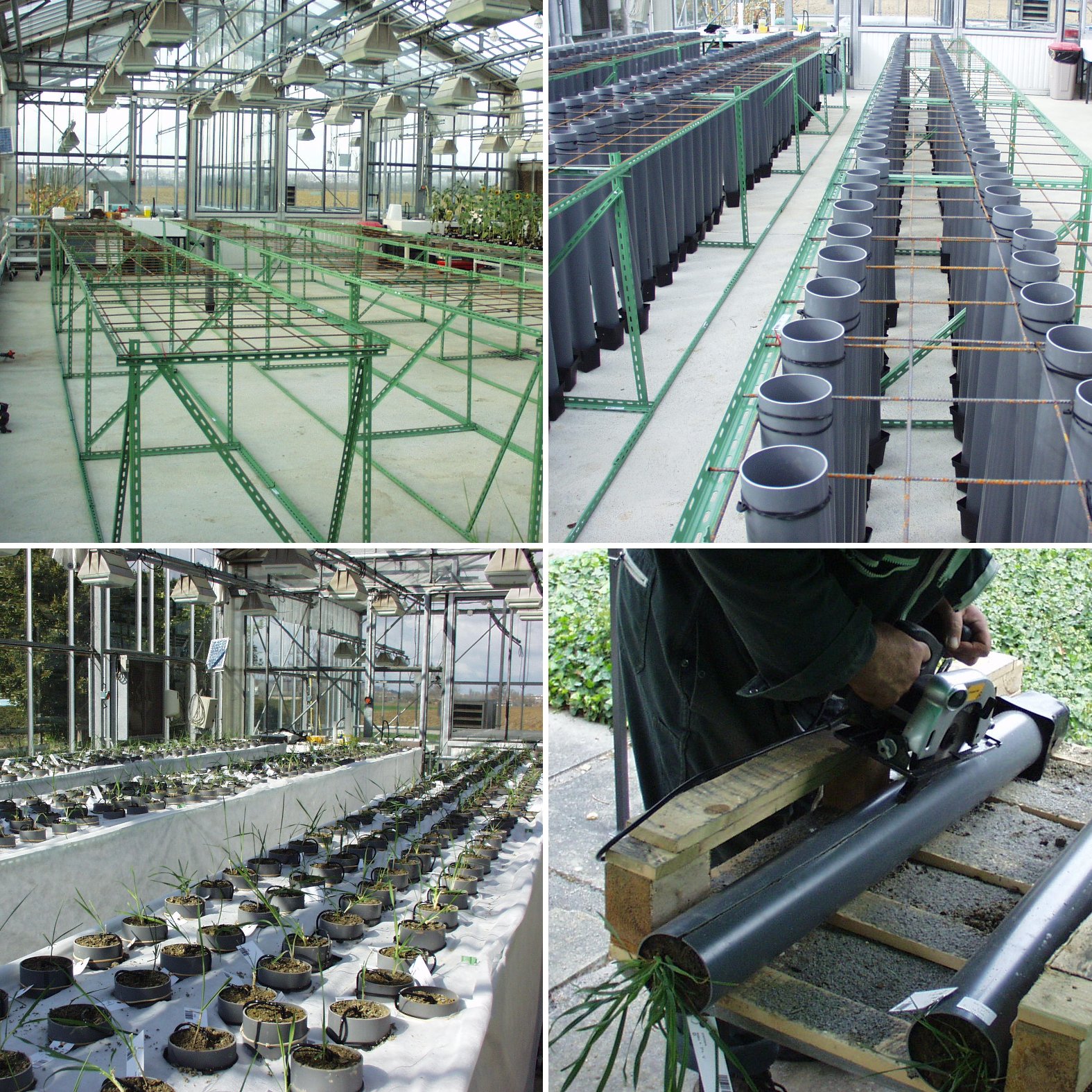 Small pots do not allow a « natural » root system development particularly in depth, which results in the plant becoming potbound. In order to go-over these problems we chose to grow plants in mesocosm made made from PVC cylinders (1m deep). This mesocosm allow much deeper rooting and can prolong the experimental period before a plant becomes potbound. We grown grassland species (grasses and légumes) more than 100 days in this system.