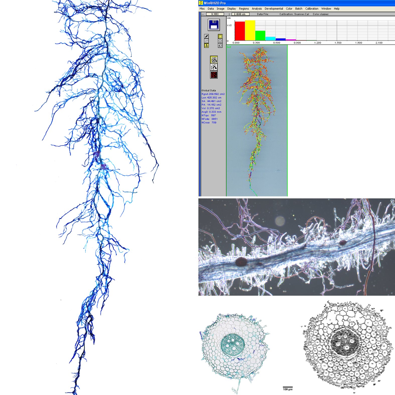 Successive stage of root analysis : Right, stained roots for numerisation; Top-left, winrhizo results; Middle-left, roots prepared to observe mycorhiza; Bottom-left, root cross section and its analysis